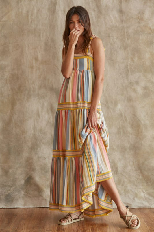 Tie Strapped Maxi Sundress - Pink Mustard Blue