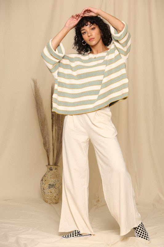Wide Arm Horizontal Knitted Stripe Pullover Sweater Sage Multi