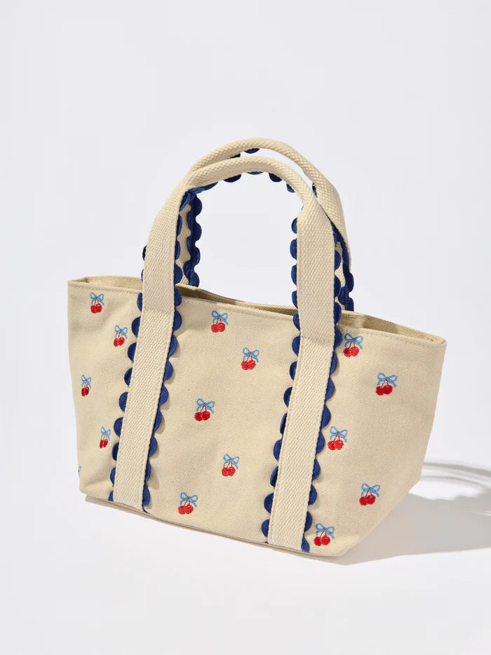 Add a pop of playful charm to your everyday look with the Cherry Icons Mini Tote. This compact canvas bag features adorable embroidered cherry motifs with blue bows, finished with sweet scalloped trim and sturdy double handles. A magnetic snap closure keeps your essentials secure, while the bright interior includes one slip pocket and one zip pocket for added organization. It’s the perfect grab-and-go bag for sunny strolls, weekend picnics, or a splash of whimsy on the go.