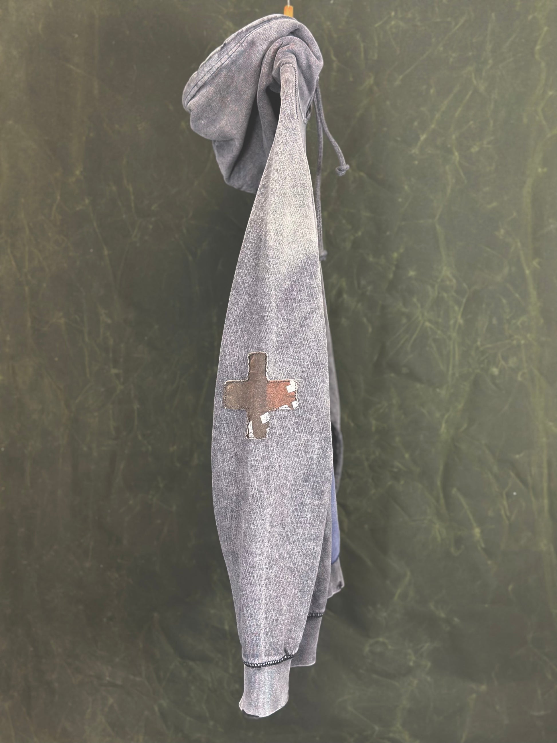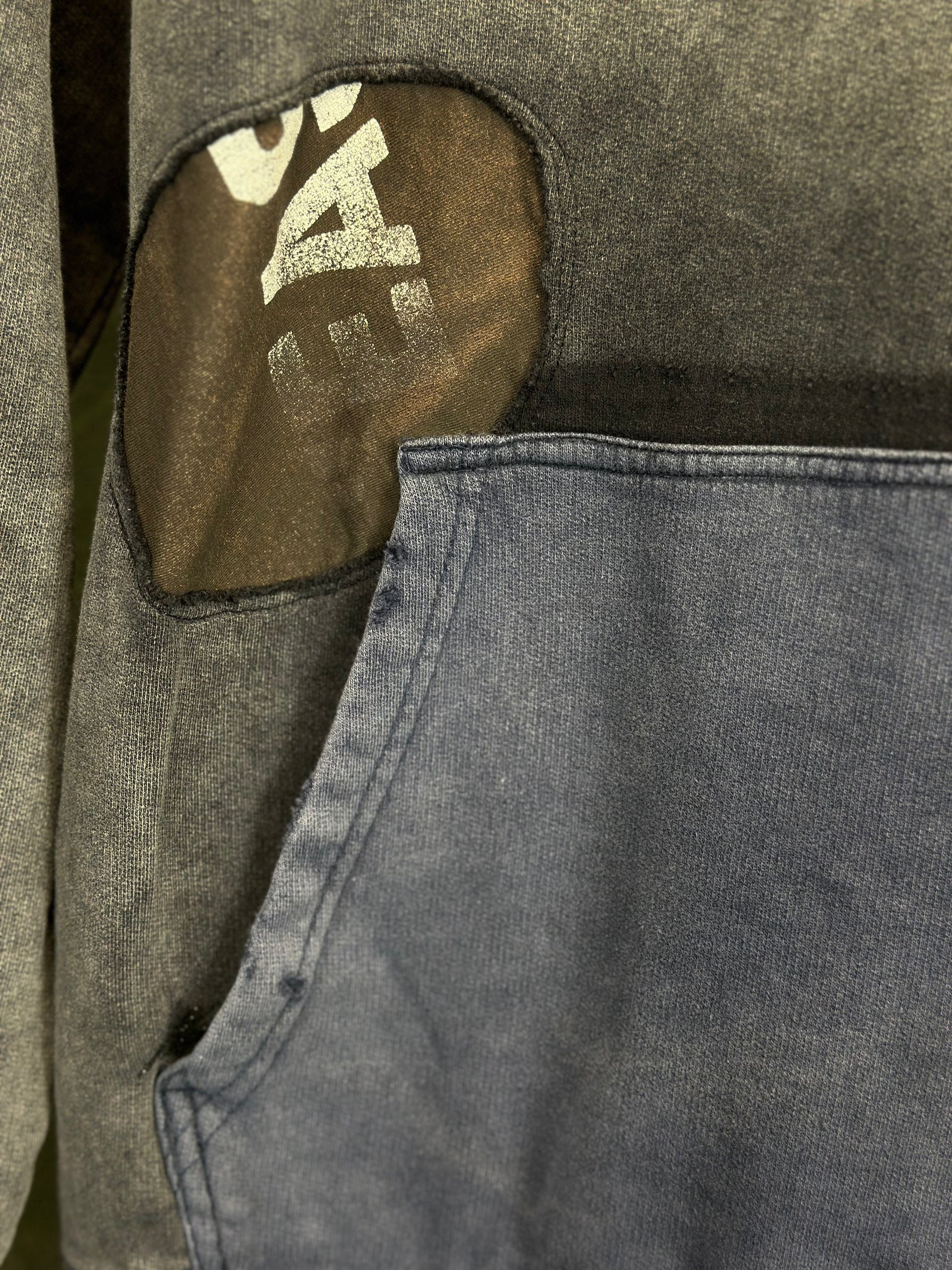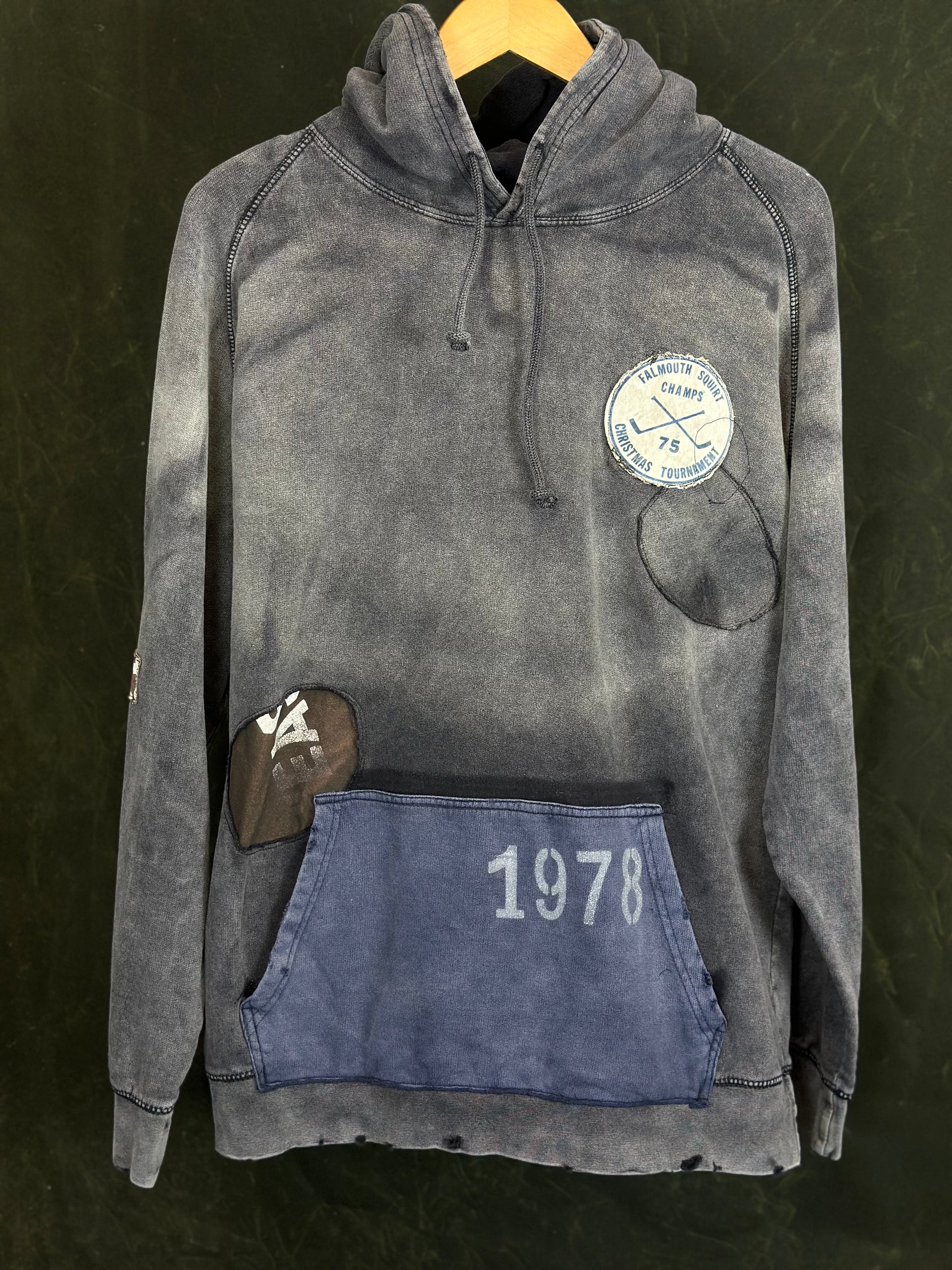 The Christmas Tournament Hoodie is a part of our one of a kind series of hoodies made right here at Blue Seven...and in our driveways....and with a needle and thread while watching The Office...well you get the point. We've put a lot of work in to each one of these to make sure each one is special and completely unique. With distressing and repairs, stencils, sandpaper, bleach, patches and the cutting up of some of our favorite old pieces to incorporate into the hoodies you'd never guess someone didn't wear it every day for 10 years to break it in just for you.