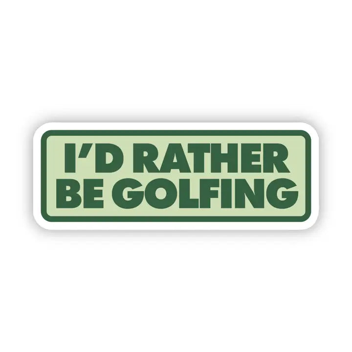 Show your true passion with this bold "I'd rather be golfing" text sticker. Perfect for your water bottle, or anywhere you want to share your love of golf! High quality vinyl sticker. Great to decorate laptops, water bottles, car windows, coolers, suitcases, bikes, kayaks, phone cases, journals, and more. Details: • 3.0" x 1.1" • Printed and shipped with care from the U.S.A. • High quality and durable vinyl, indoor and outdoor use • Waterproof and weather resistant