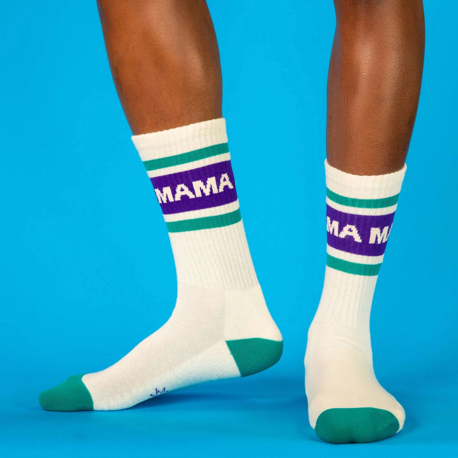 These super-comfy, unisex, one-size-fits-most Gym Socks are made in the USA of Natural Cotton with accents of Teal Nylon, Cream Nylon, Purple Nylon.