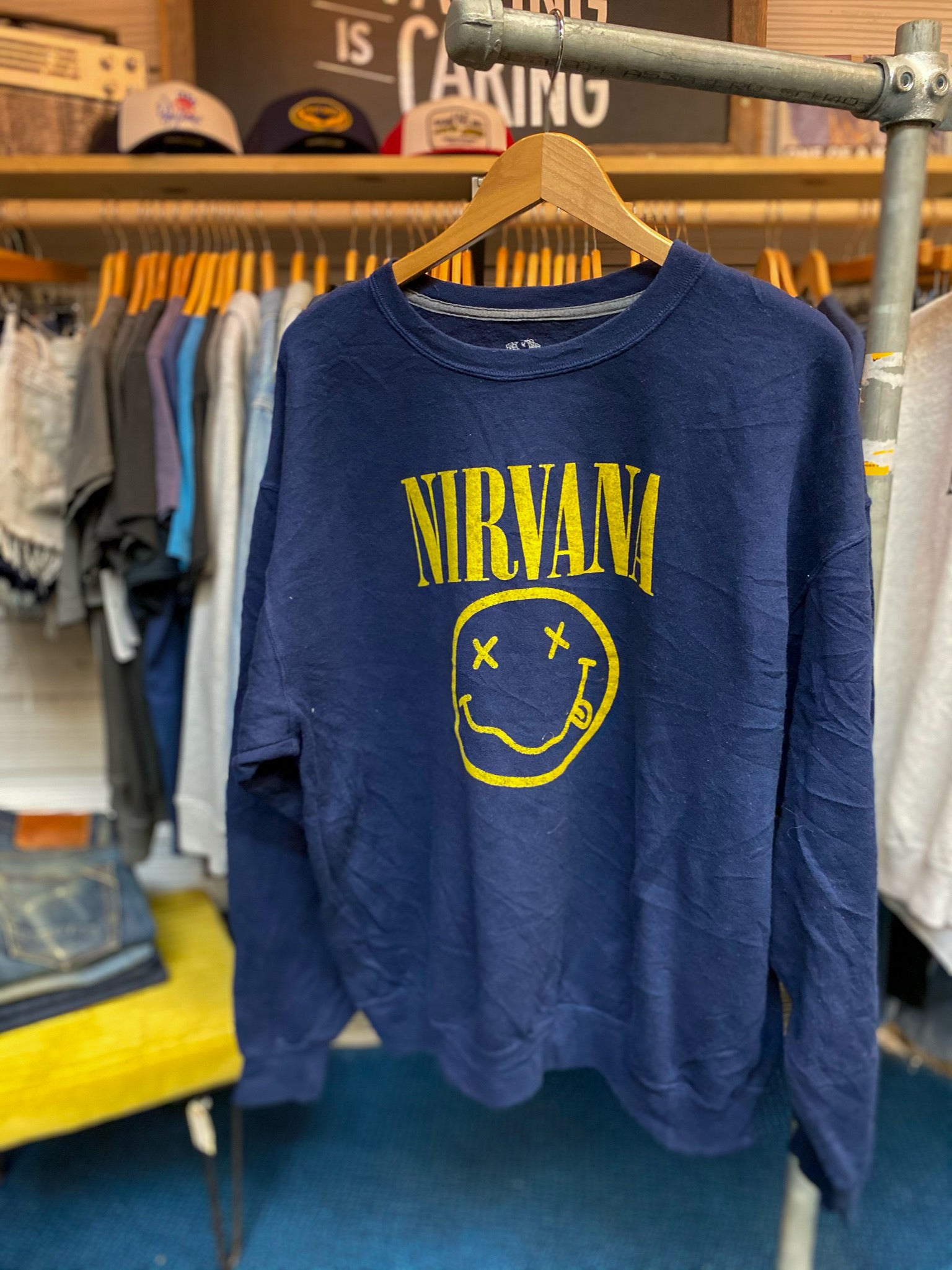 Vintage blank with a classic Nirvana design screenprinted on. Because this is printed on a well worn vintage blank, it has that perfect soft worn-in feel that will make you want to wear it again and again.