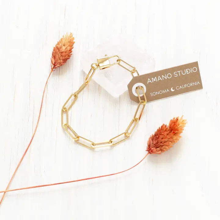 The paperclip chain trend is still going strong! We've added this cool padlock clasp to give it an edgy statement. The chain is 7" and made of 14k gold plated brass + coated to resist tarnish and create a hypoallergenic surface.