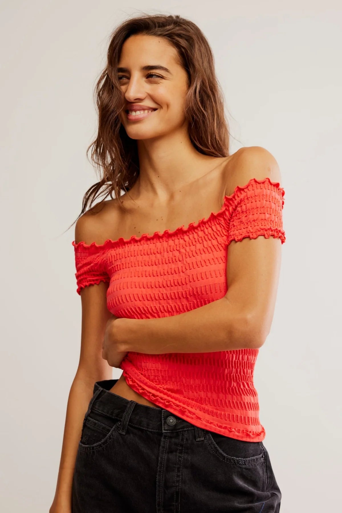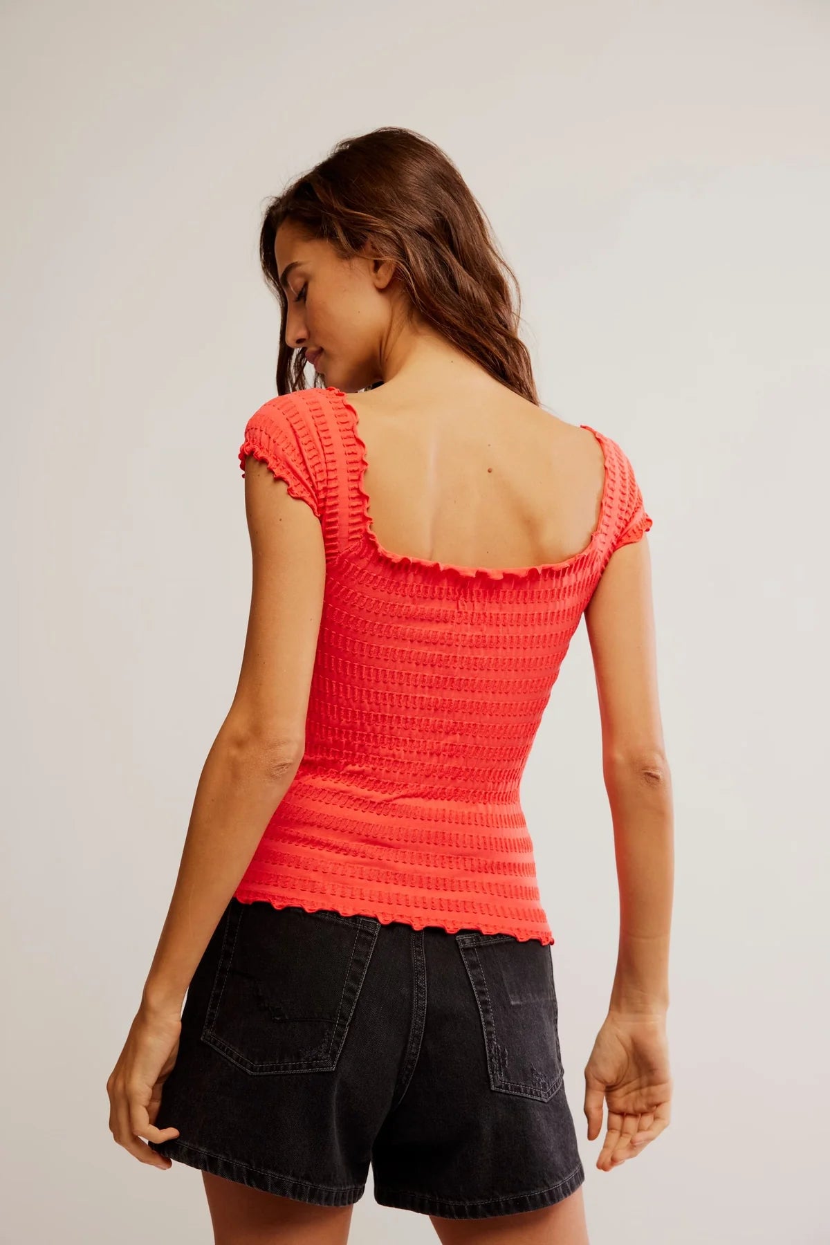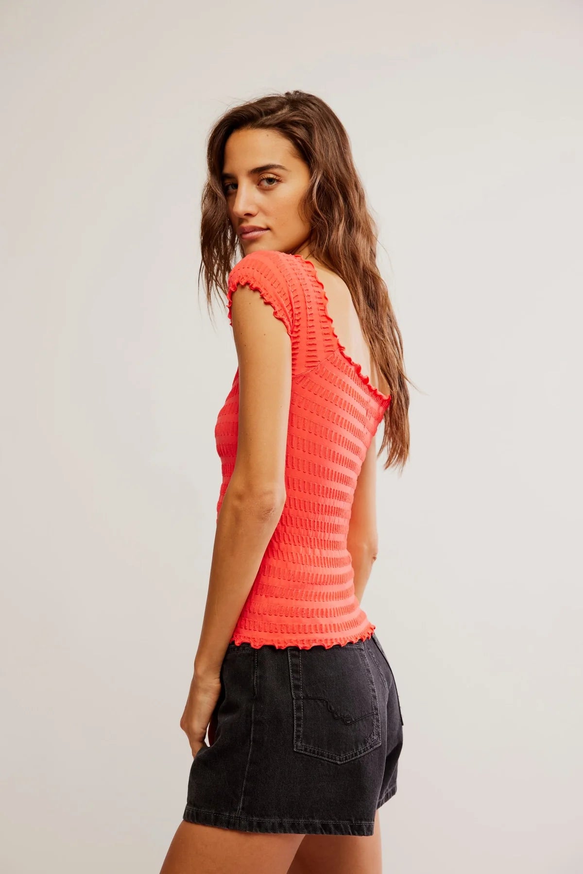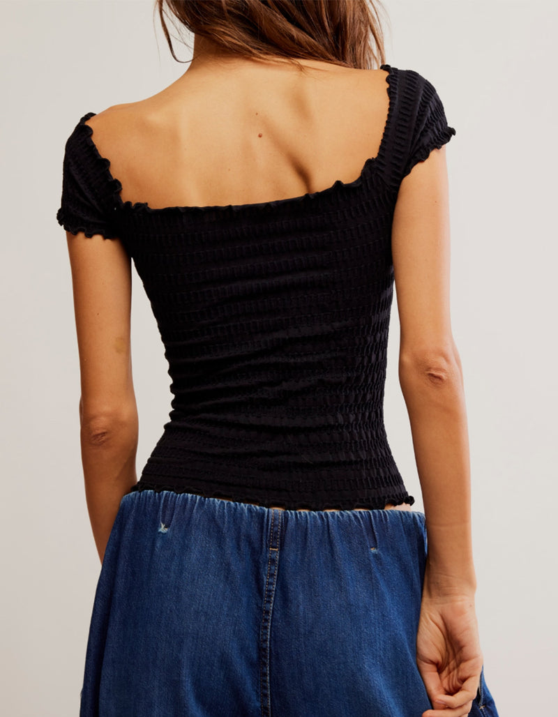 This Free People Pucker Up Seamless Tee adds a unique twist to a basic shirt with its lettuce hem, square neck that can be worn on or off the shoulder, and knitted puckered fabric for added texture. Elevate your casual style with this versatile and comfortable top.