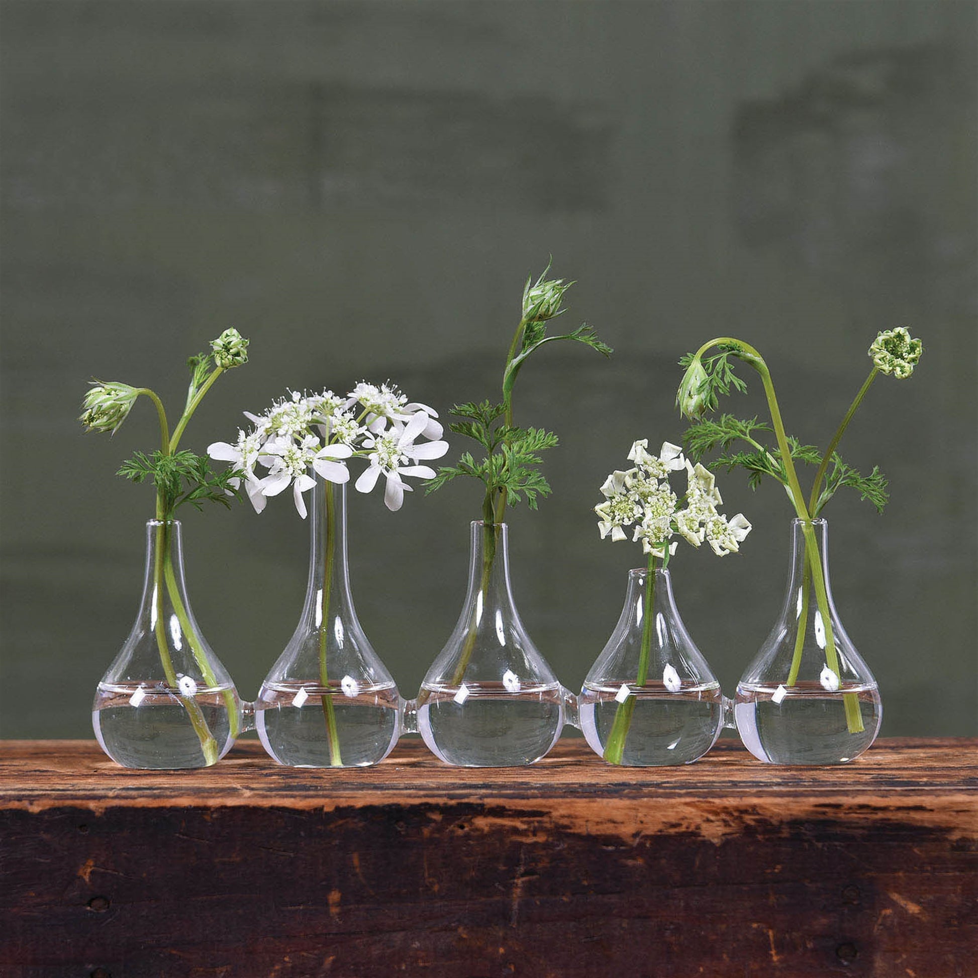 A quintet of joined glass vases comes together as an instant arrangement for single stems and floral cuttings.
