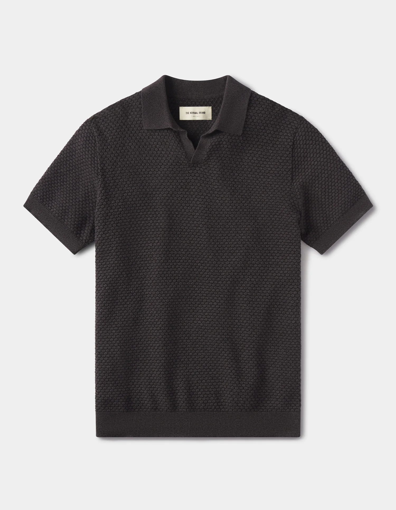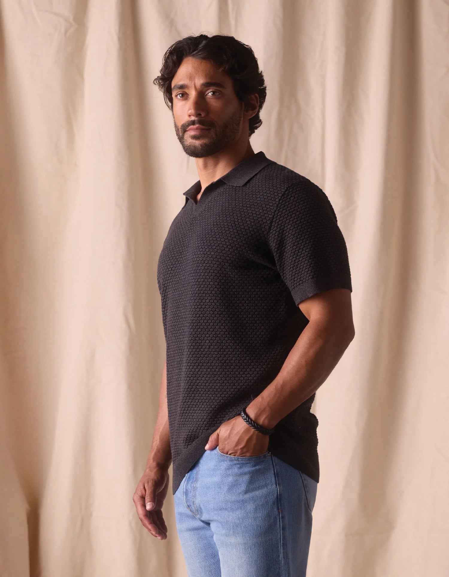 Vintage charm meets modern comfort. This polo is a true-to-size, lightweight knit shirt made from 100% Cotton Robles Yarn. It has a soft, classic cotton feel with a subtle stretch, and features an all-over novelty micro float jacquard pattern in two-tone colors for extra dimension. Key details include a contrast color rib collar, and a clean, button-free rib center front placket. Additional details include inset sleeves with contrast rib cuffs and a contrast rib bottom band.