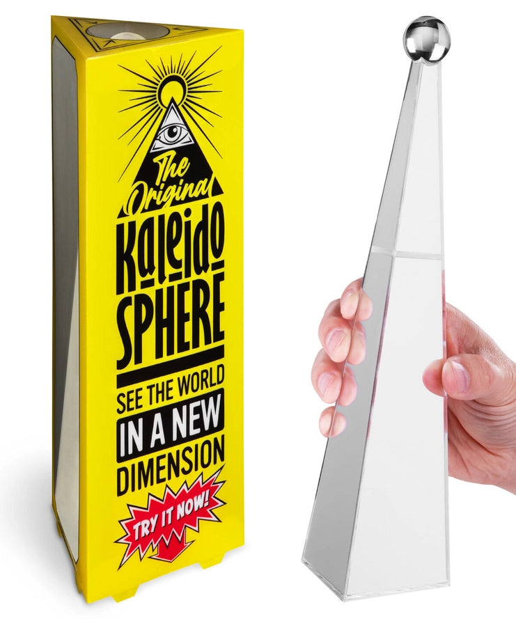 Put down those homemade kaleidoscopes made of cardboard and tissue paper and treat yourself to the eye-catching Original Kaleido-Sphere! While a traditional kaleidoscope generates patterns from pieces of colored paper, this three-sided, mirrored tetrahedron is cleverly designed to utilize the light around you and transform it into incredible reflected images like you’ve never seen! Gaze into the triangular base, and you’ll be amazed as you seemingly get a glimpse of an alternate universe of geometric beauty. Point it at your window, TV, or LED light strip, and the colors inside shift as well! Tilt the whole base higher, and small beads will slide down the mirrored insides which also reflect the light, making for fun illusions of light coming at you. With this trippy desktop tower as your view master, you won't want to look at anything without it!